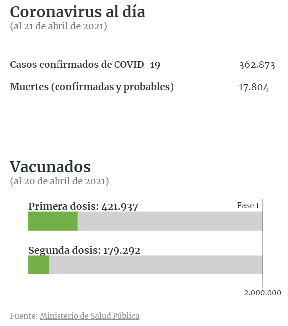 Abril 22, 2021 (El Universo).- Aproximadamente, actualizado hasta 21 de abril (contagios y muertes) y hasta el 20 de abril (vacunados), del total de 17 millones de habitantes de Ecuador, 2,13% de la población contagiada, 0,11% de población ha fallecido por el virus, 2,48% de vacunados en primera fase y 1,05% vacunado con segunda dosis.