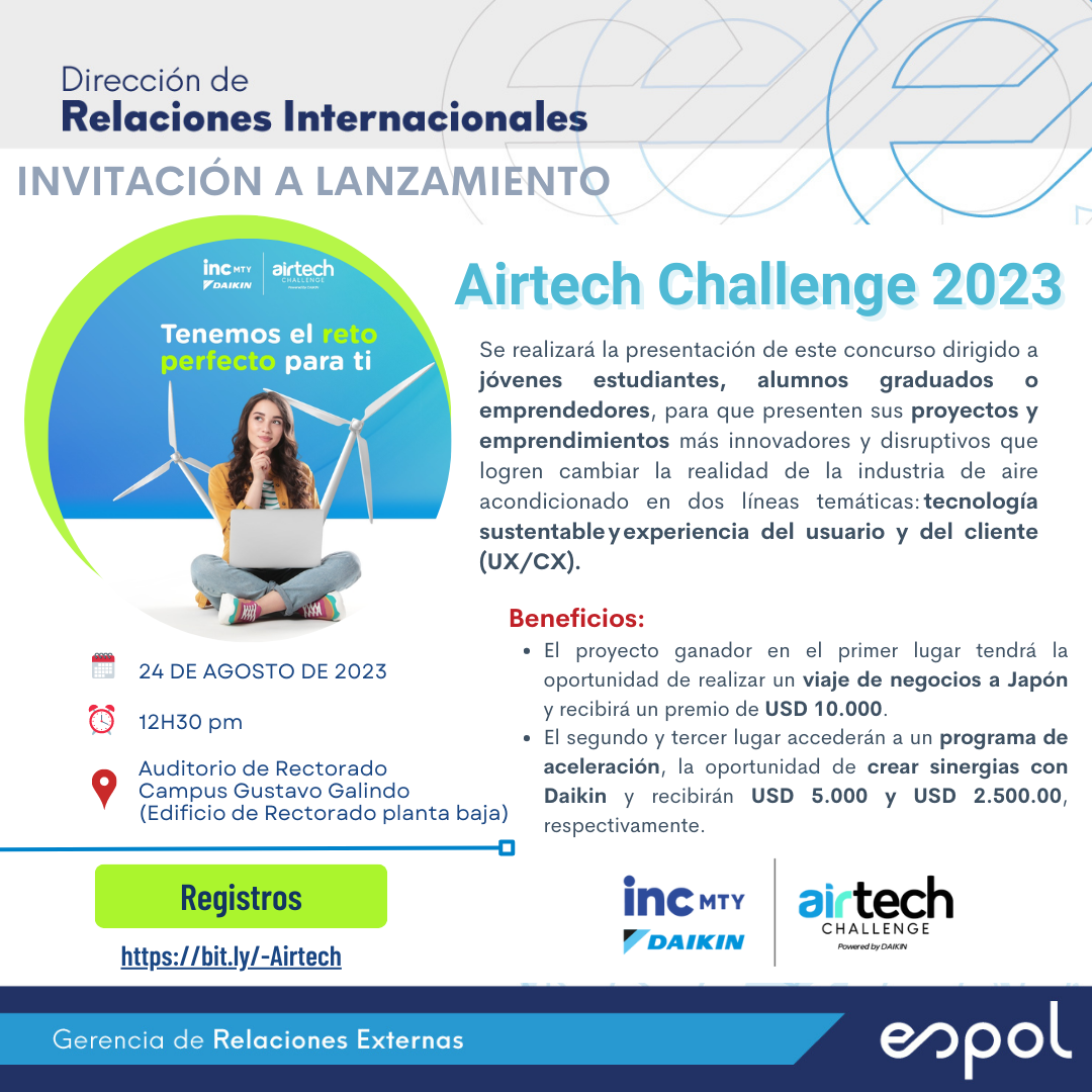El día 24 de agosto de 2023, a las 12H30 se llevará a cabo el lanzamiento del Airtech Challenge 2023, un concurso dirigido a jóvenes estudiantes, alumnos graduados o emprendedores.